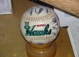 南海時代の寄せ書きサイボール。1988年との記載があるので最終年のモノ。ハンドボールくらいの大きさがある。