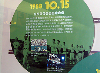 かつてドームアネックス2Fにあったドームミュージアム。アネックスとは、いまグッズショップのダグアウトのある場所と思われるので、その下の階にあったという事になります。(記憶ではドーム側に入口があったように思うんだが…)1994年に初めて福岡ドームへ行った際に、見に行きました。そのときの写真を少し紹介します。いまビッグライフには南海時代の展示品は少ないが、当時はもう少し展示してありました。何年に閉鎖されたかは不明ですが、その後展示物はビッグライフに移され、一部はVIP観戦室のレジェンドルームにも移したようだけど…今は?? |