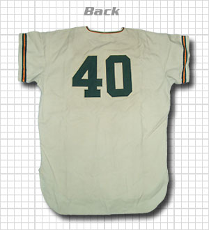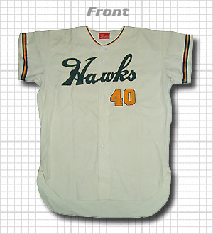 名将鶴岡監督の後任として1969年に飯田徳治監督が就任したときに採用されたモデル。前年まで使用されたユニフォームは鶴岡監督のイメージが定着しているため、一新されたものと思われます。強い南海を象徴する太い肩ラインを廃止し、明るくオレンジ色のラインを追加しました。この緑と黄橙の組み合わせは、後の野村監督時代のユニフォームの原点となっているのではないでしょうか。このユニフォームから胸番号が採用され、前ボタンも比翼仕立てを廃止し、デザイン的な変更もされています。しかし、その年に戦後初の最下位といういう屈辱の結果になり、飯田監督の退任ともにたった1年で廃止されました。そのため、かなりの貴重品ではないでしょうか。 |