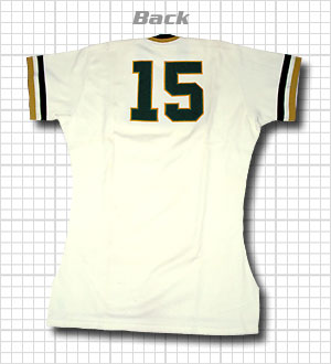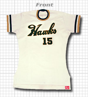 1974年に使用されたもので袖マークなしの最終版。見た感じは、1973年・飯山投手のユニフォームとほとんど変わりないです。細部でいえば、胸マークの「Hawks」ロゴが若干違います。フチドリの黄土色部分が細く「w」の部分に注目すればよくわかります。このユニフォームは74-15のタグがあり、村上雅則投手のモノとわかります。村上投手は、マッシー村上の名前で日本人メジャーリーガー第一号ということで有名です。15番は、米国より復帰後の背番号。渡米前は10番をつけていました。なお1974年オフに阪神タイガースにトレードとなってしまうので、このユニフォームは南海在籍最後のユニフォームという事になります。