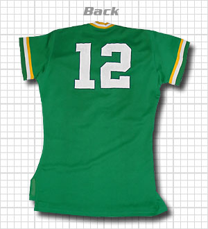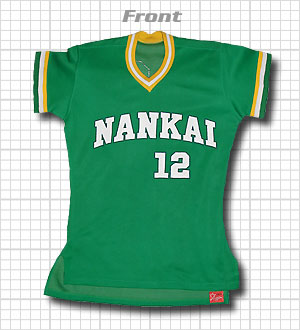 1974年〜1976年の間に使用されたモデル。前年までビジターはグレーだったが、上着のみグリーンという配色のビジタータイプが登場。1975年よりホーム用と同様に、前出の野村監督夫人がが版権を持つと言われる鷹の上に子供がのったペットマークのワッペンが左袖につく。このユニフォームにはそれがなく、またはがした跡もないので、1974年モデルと推測(タグに年度記載なし)しました。この頃はホーム・ビジター各2種類のデザインがあり、今までの深緑という色から派手なカラーリングに変更されて行きました。この後、首・袖・肩などのラインのデザイン・配色を変更しながらも南海最後の1988年までこのイメージが踏襲されることになる。