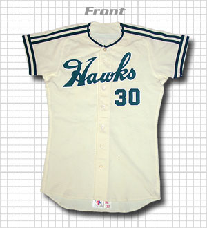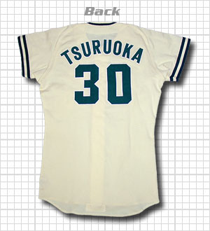 1984年から採用された南海ホークス最後のモデル。何故、鶴岡監督の南海最終型ユニフォームが存在するのか?実はコレ、東西対抗のOBオールスター戦用に作られたものだそうです。そのため、ライン等に実際と多少異なる点があります。(下記ZOOM UP参照)製造が本来の久保田運動具店ではなく、デサントが手がけています。(当時ビジターはデサント社製)本来ならばレプリカ?という事にもなるかも知れませんが、実際の選手(監督)の実使用品なので、この項目にいれております。
