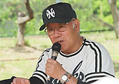 外観での大きな違いは、肩のラインが首の所まで突き抜けています。実際は首のラインまで(1988年西選手使用品を参照)です。右の岡本伊三美氏の写真ですが、2003年に実施された野球教室のものです。上の鶴岡監督使用品と同様に肩ラインが出ています。肩袖のライン素材ですが、本来はジャージできており、肩ラインは編み込みですが、これは上からの貼り付けとなっています。また袖ラインは緑白緑白の合計幅は40ミリラインなのですが、こちらは緑白緑の30ミリラインとなっています。ただし岡本氏の写真ではは緑白緑白となっています。(という事は、このときとは違うときに作られたものでしょうか?) |
