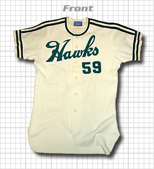 1988年の南海ホークス最後のモデル。長年低迷を続け、名門復活をかけて1984年よりこのモデルを採用。かつての黄金時代を彷彿させるデザイン・カラーリングが復活しました。かつての時代よりは少し発色の良い深緑です。生地色も当時よりかなり黄色いアイボーリーかクリーム色といった感じになりました。鶴岡監督時代、広瀬・ブレイザー時代に採用された強い肩ラインは、ホーム用のみ継承されています。また1971年以来の上着が前ボタン式、パンツがベルト式が復活しました。