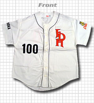 ダイエーユニフォームのベースボールシャツです。レプリカメッシュジャージと違い素材が綿100%できており、着心地がしっかりしています。胸のロゴ、番号および背番号が刺繍やワッペンでなくプリント(印刷)されたもの。袖の球団ロゴマークなぜか刺繍になっています。オフィシャルグッズなのでロゴ刺繍の精度は高いほうです。写真は旧タイプで後期バージョンは背番号が入っておらず、ビジター用の右袖にFUKUOKAの文字が入り、ボタンも白に変更されています。背番号と背ネームは別注で任意の番号が入れれました。実在選手の背番号・背ネームが入ったバージョンも販売されていました。