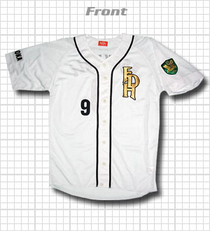 2003年の優勝記念グッズとして限定販売されたユニフォームのメッシュジャージです。胸ロゴと背番号は金色です。金色というと一瞬ケバイ感じがありますが、実物を見ると意外と落ち着いた感じです。むしろシャープ産業製品の蛍光オレンジに近い胸ロゴのほうが、かえってケバく感じました。写真はホークスタウンより購入の際に背番号と背ネームをプラスしてます。通常販売の場合、胸番号・背ネーム・背番号は入っていません。また左袖のV3ワッペンは、別に販売されていたもの取り付けており、元々は付いていません。