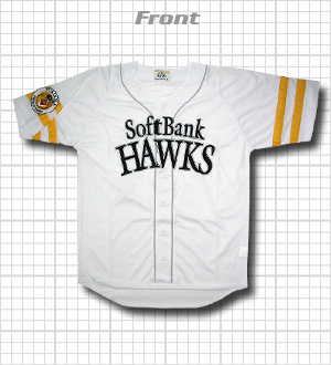 ソフトバンクホークスのメッシュジャージです。正直こんなダサイユニフォームを採用するとは思わなかった……。これはファンクラブ特典用のメッシュジャージです。一見するとまずまずのできかと思われますが、よくよく見るとあまりスタイルが良くない。ダイエー時代からそうであるが、メッシュジャージは何故か袖が長い。次に首回りがユニフォームより広く作られているため、胸マークがちょっと下付きに見えてしまう。袖章ワッペンも刺繍が粗いなどが挙げられる。市販のメッシュジャージ(ミズノ製)が5900円に対し、FC会費の3800円で付いてくるのだから良しとすべきでしょうか。