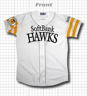 ソフトバンクホークスのレプリカモデルです。管理人が所属するホークス関西応援会のユニフォーム。ダイエー時代のモノ同様にミズノ製のホンモノのユニフォームです。ただしミズノ製でもブランドが違います。選手仕様との違いは、メッシュ素材自体の違いやセミプルオーバーではなく前がすべて開くことです。球団ロゴの刺繍ワッペンは選手用と同じ。本来袖に「MCコーポレーション」の広告と入るところに「KANSAI」と入れています。これも球団から認可を得て製作しております。